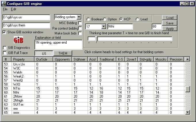 Here's the configuration screen for the GIB engine. Notice some of the features: - Choice of carding convention (most common leads, some 30 in all, enumerated) for both you and opps. - Some **SEVENTY** bidding conventions for both you and opps including some unusual treatments. - **SIX** Standard bidding systems as well as the system used by GIB in competition, M.O.S.C.I.T.O. - GIBBrowser switches effortlessly when you change your seat, too. Several conventions that are not available in the standard version of GIB. - GIB's switches for par contests and competition bidding, mostly affecting thinking time (T). |