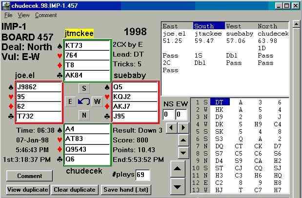 Here's a hand played by a leading expert, Carl Hudecek. Find out: * All the other 68 results on this board * Who Carl plays with and against, sorted by rating * What Carl opens the bidding with, using HCP or Kaplan-Rubens evaluation. * Other similar hands and how they turned out. * All redoubled contracts, grand slams, opening 2C bids, weak jump overcalls, or splinters * The end position from anywhere in the play with double-dummy analysis by Deep Finesse |